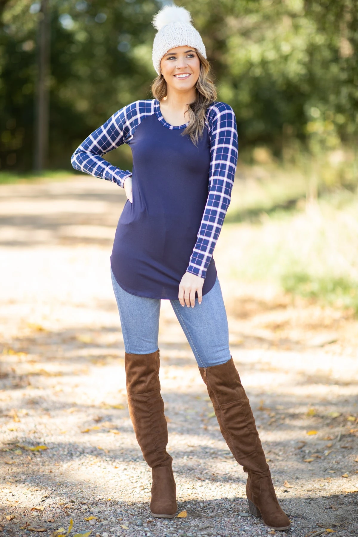 - Print: Solid With Plaid Sleeves